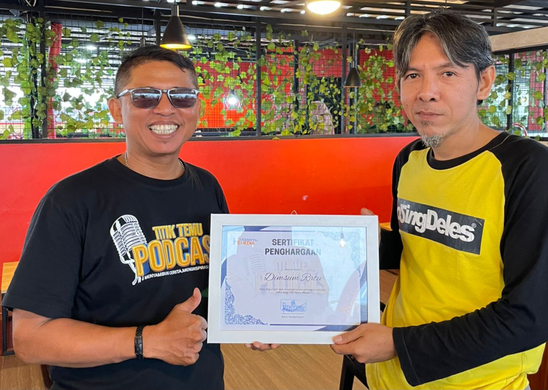 Penghargaan berupa sertifikat itu diserahkan langsung oleh kru Titik Temu Media kepada pemilik Dimsum Ratu, Mochammad Choirudin, di kedainya yang berlokasi di Jalan Margasari Adiningrat RT 03 RW 12, Kelurahan Adiarsa Timur, Karawang.